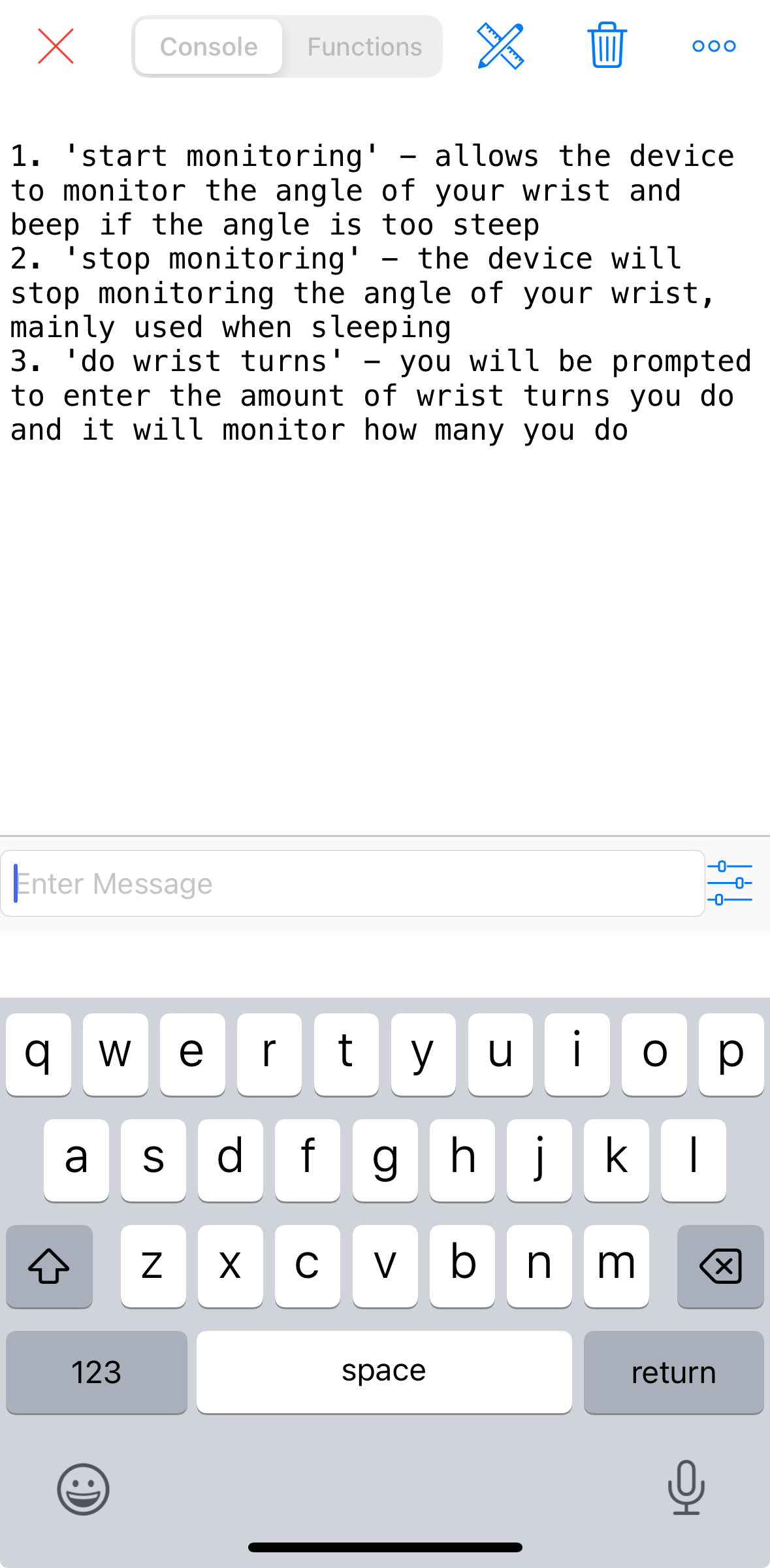 ble.println("3. 'do wrist turns' - you will be prompted to enter the amount of wrist turns you do and it will monitor how many you do");