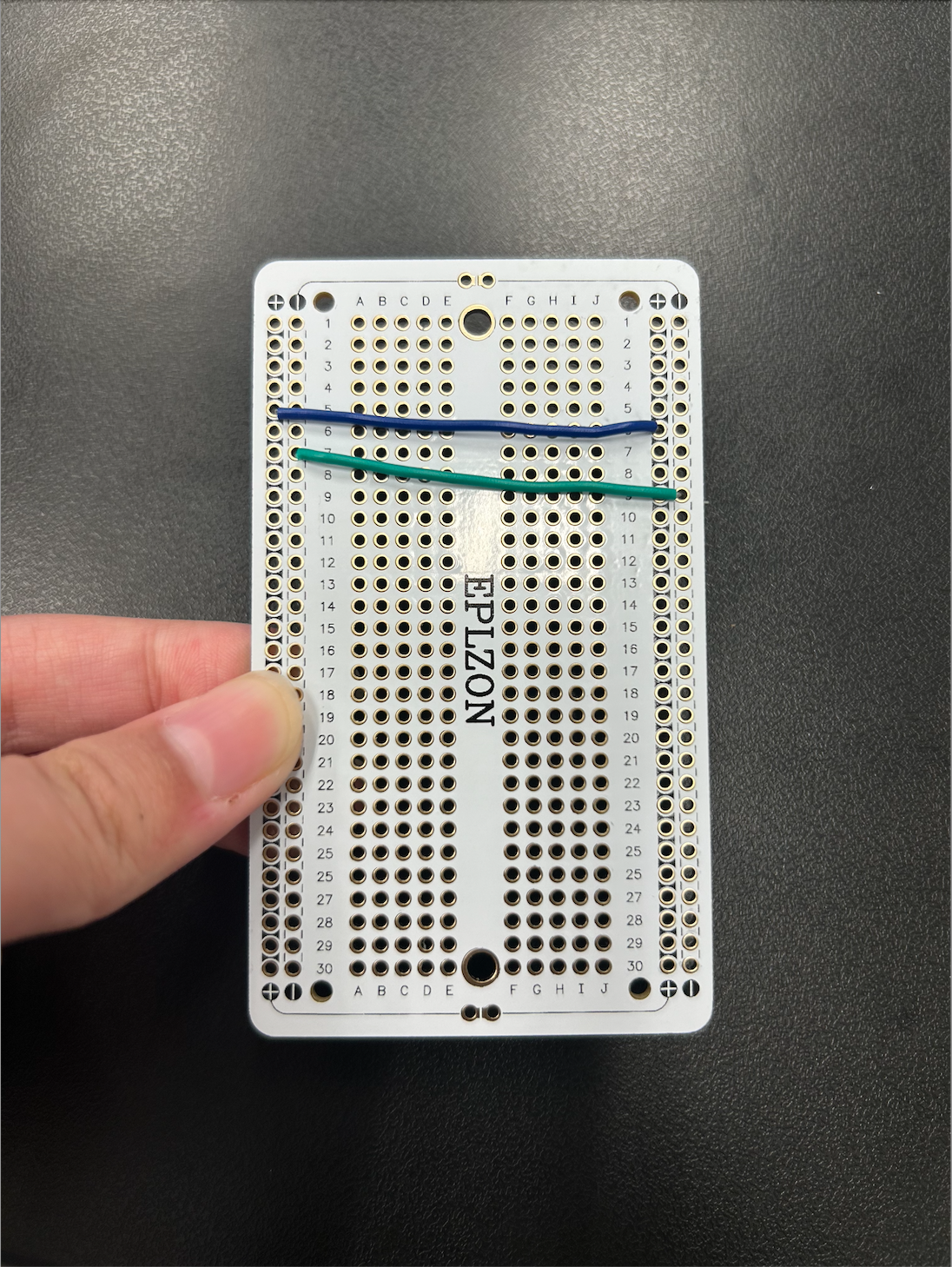 Figure #4: The PCB board with two wires connecting the power lines and ground lines
